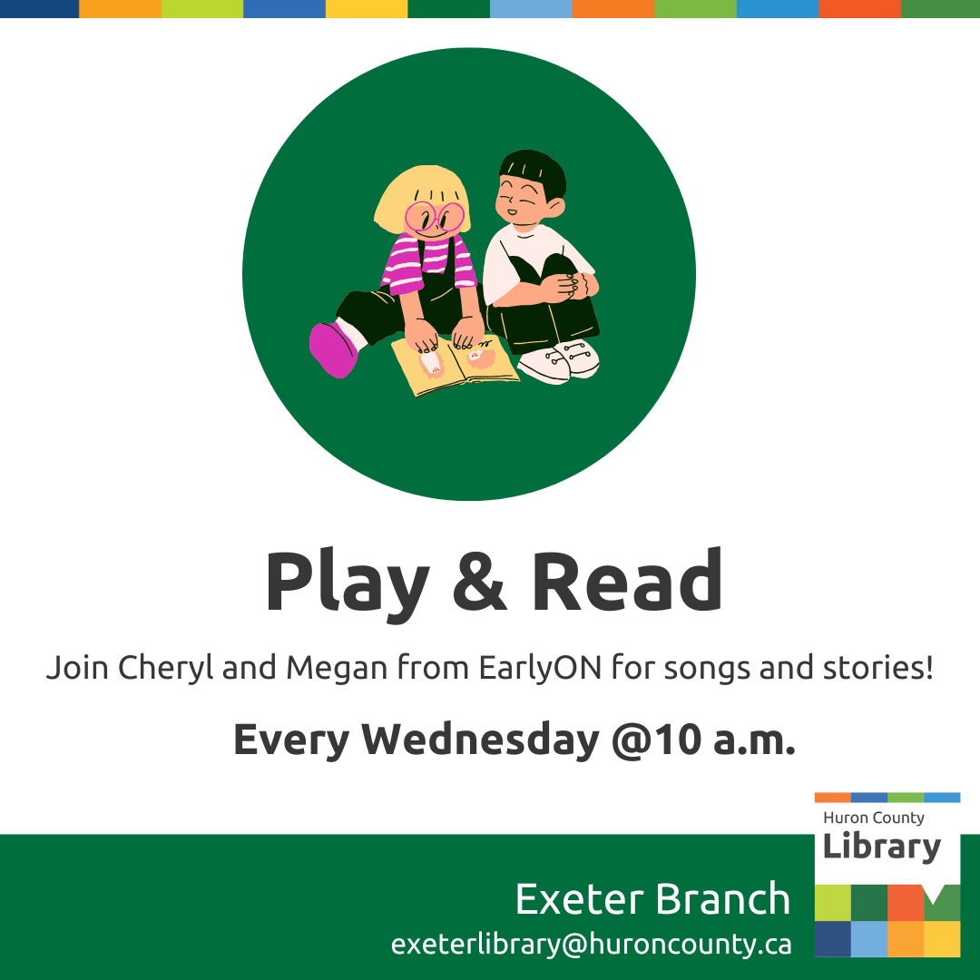 Join the Huron County Library and Huron EarlyON every Wednesday morning at the Exeter Branch for interactive play, stories and songs. This program is geared towards parents/caregivers and children 0-6 years.
