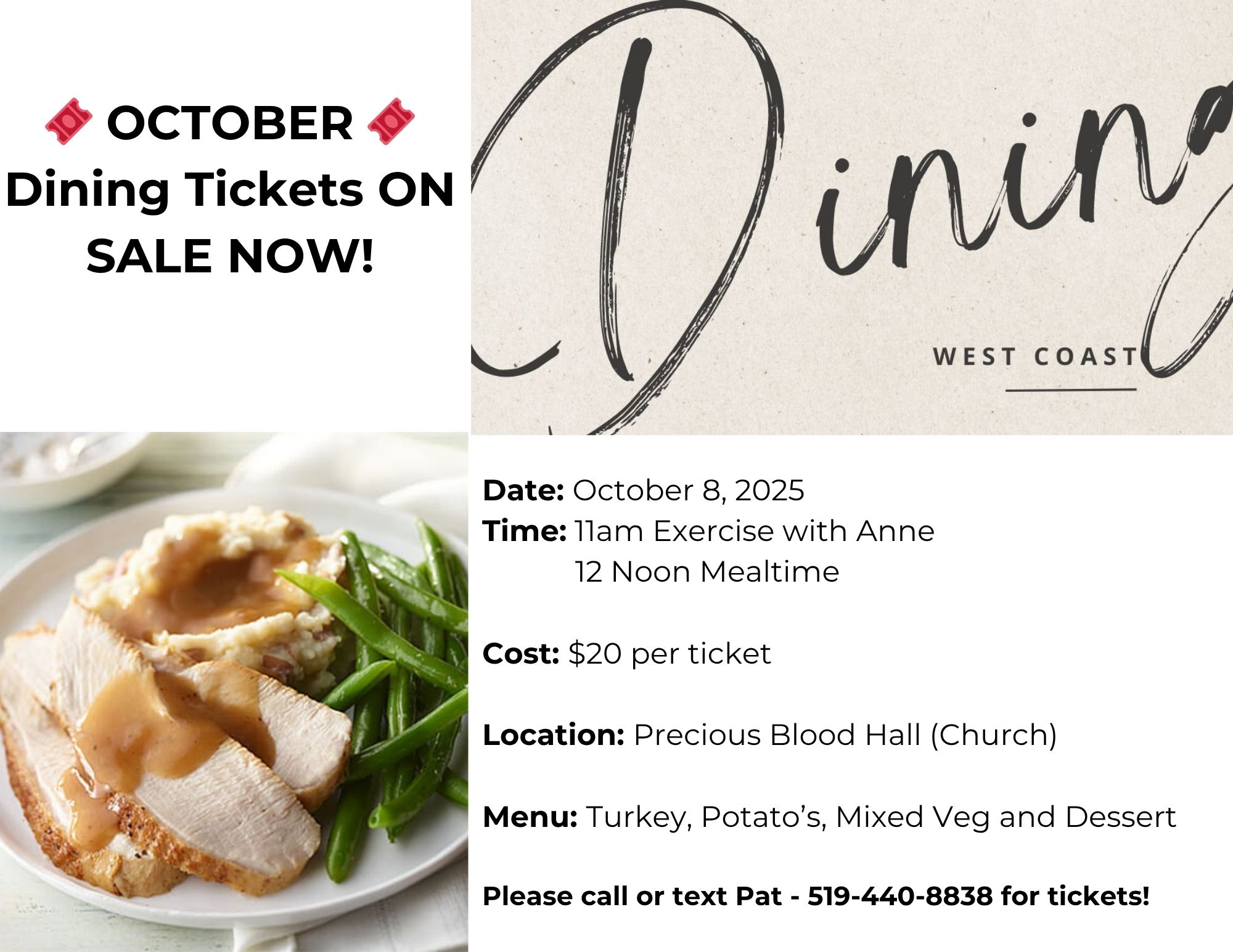 Monthly Dinner by West Coast Active Living.. featuring Hayter's Turkey- purchase ticket ahead.. including limited take out for shut ins