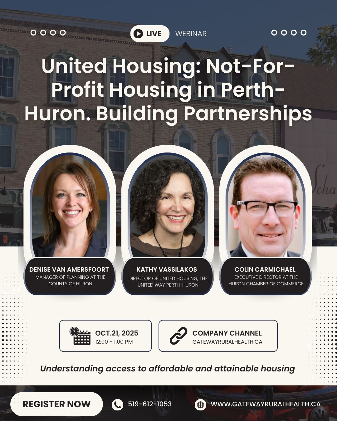 Gateway Centre of Excellence in Rural Health is hosting a free webinar on Tuesday, October 21st, 2025, from 12 - 1 PM on “United Housing: Not-for-Profit Housing in Perth-Huron. Building Partnerships.” The conversation will focus on building and planning for affordable housing in rural communities.